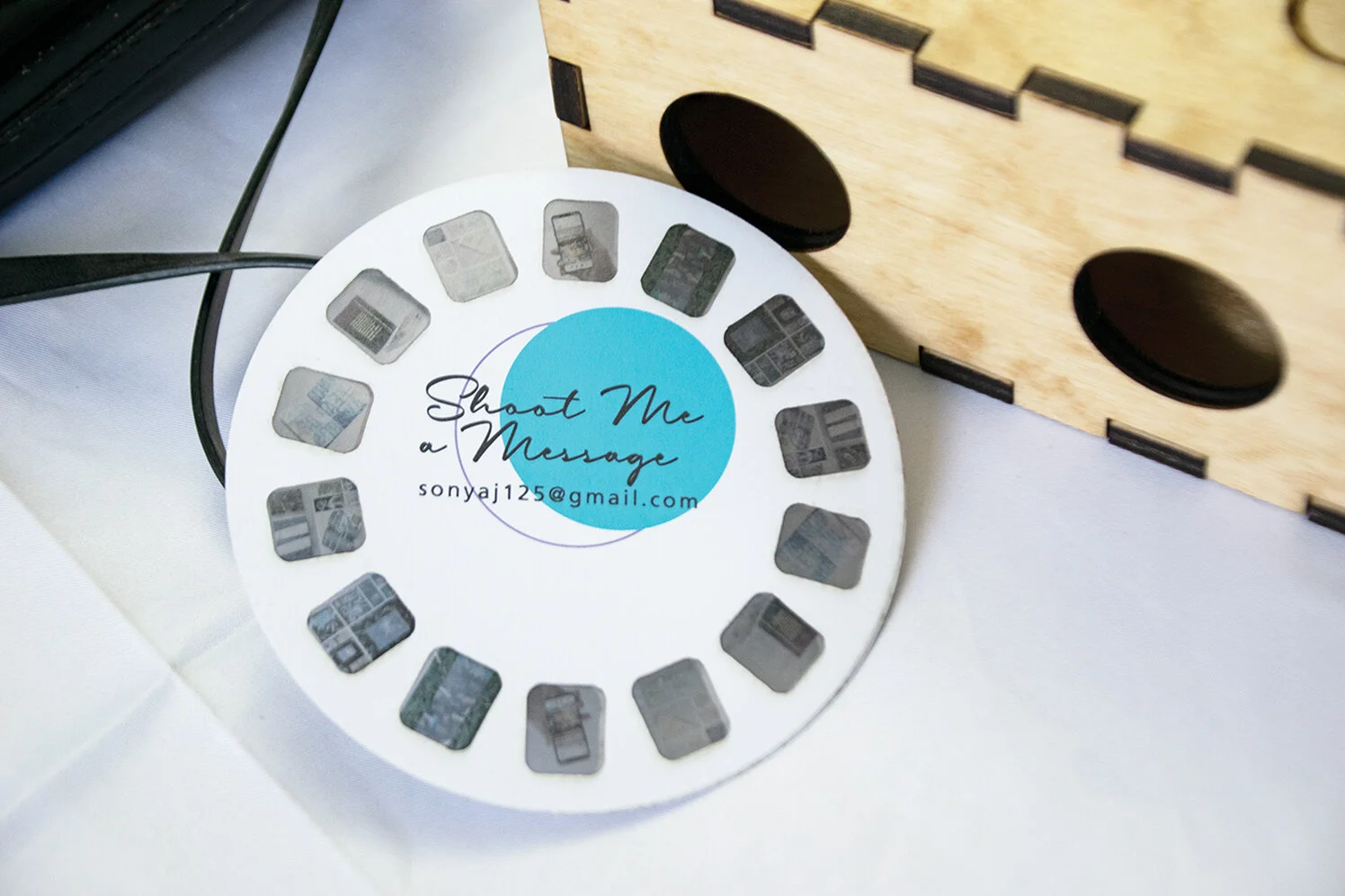 A laser-cut viewfinder leave-behind with my projects on the reel, viewable through the front eye openings.